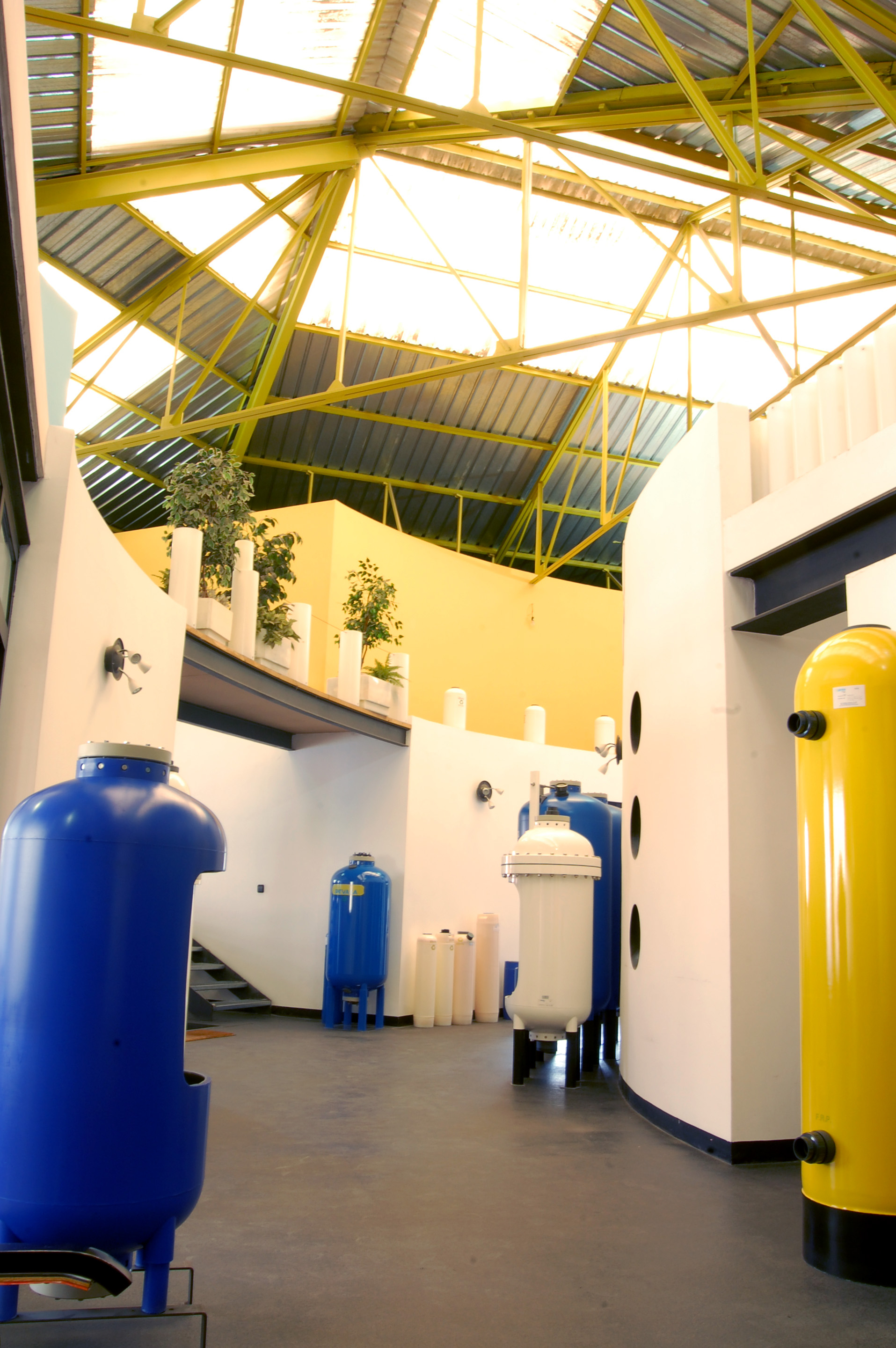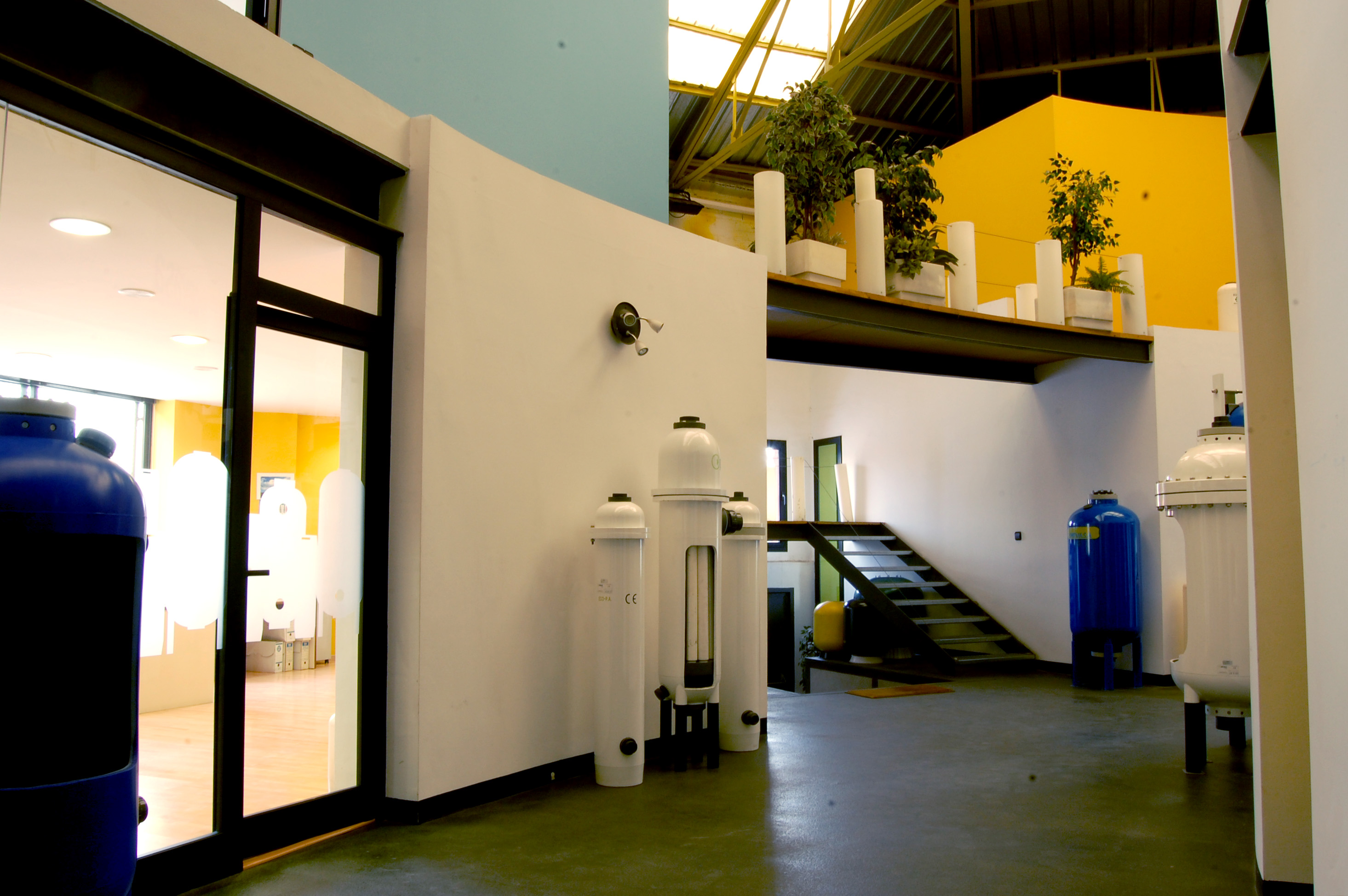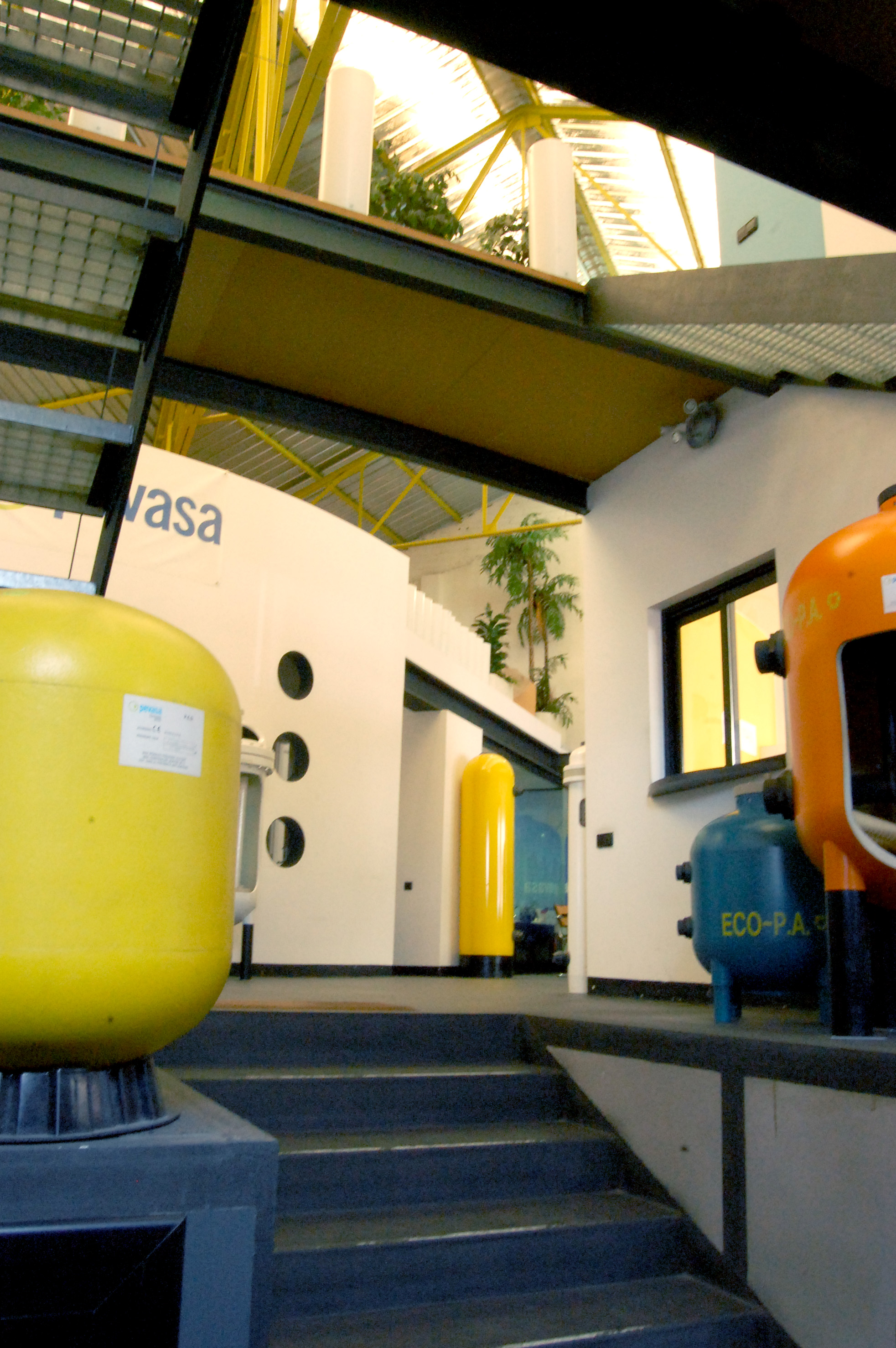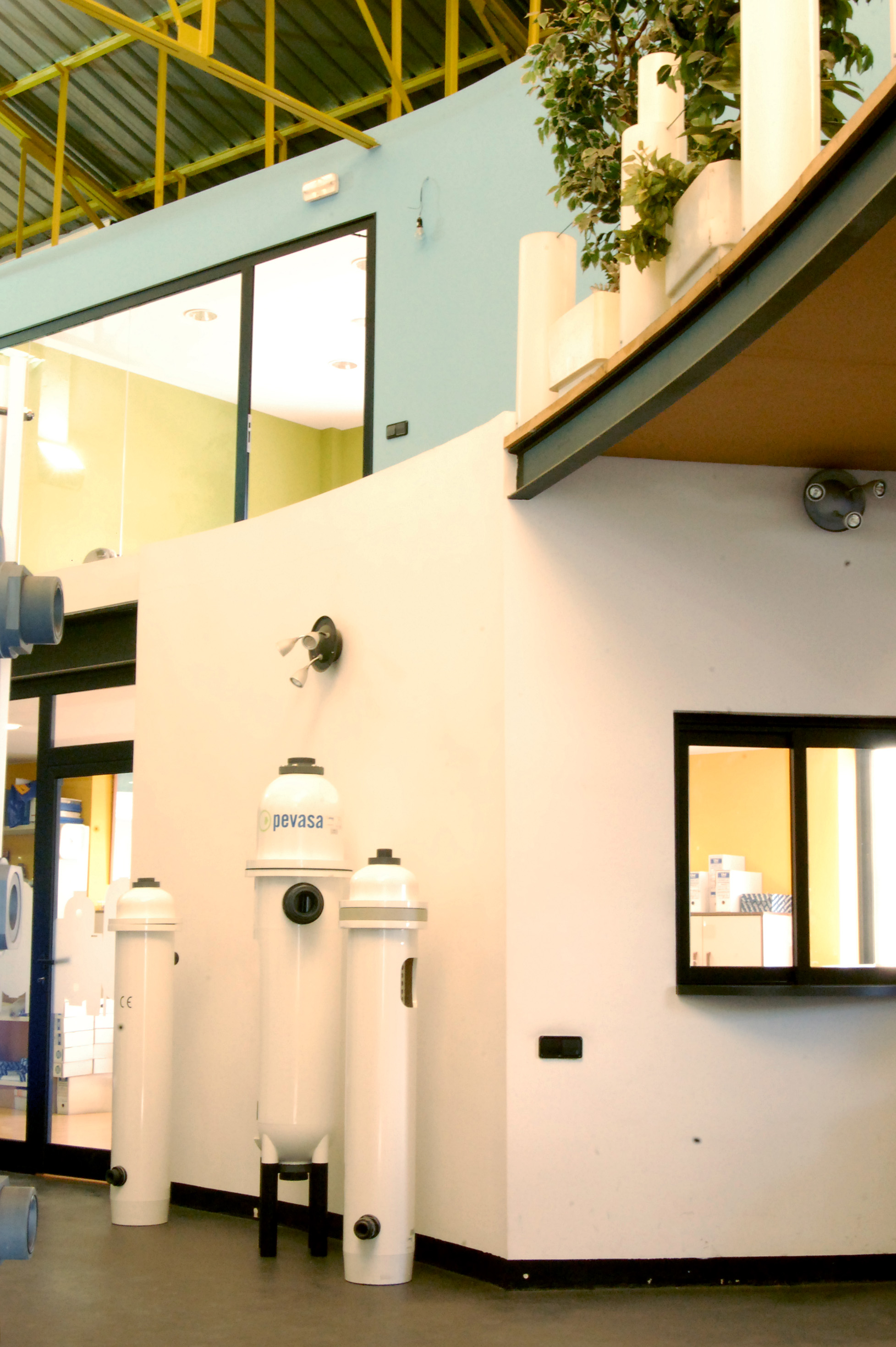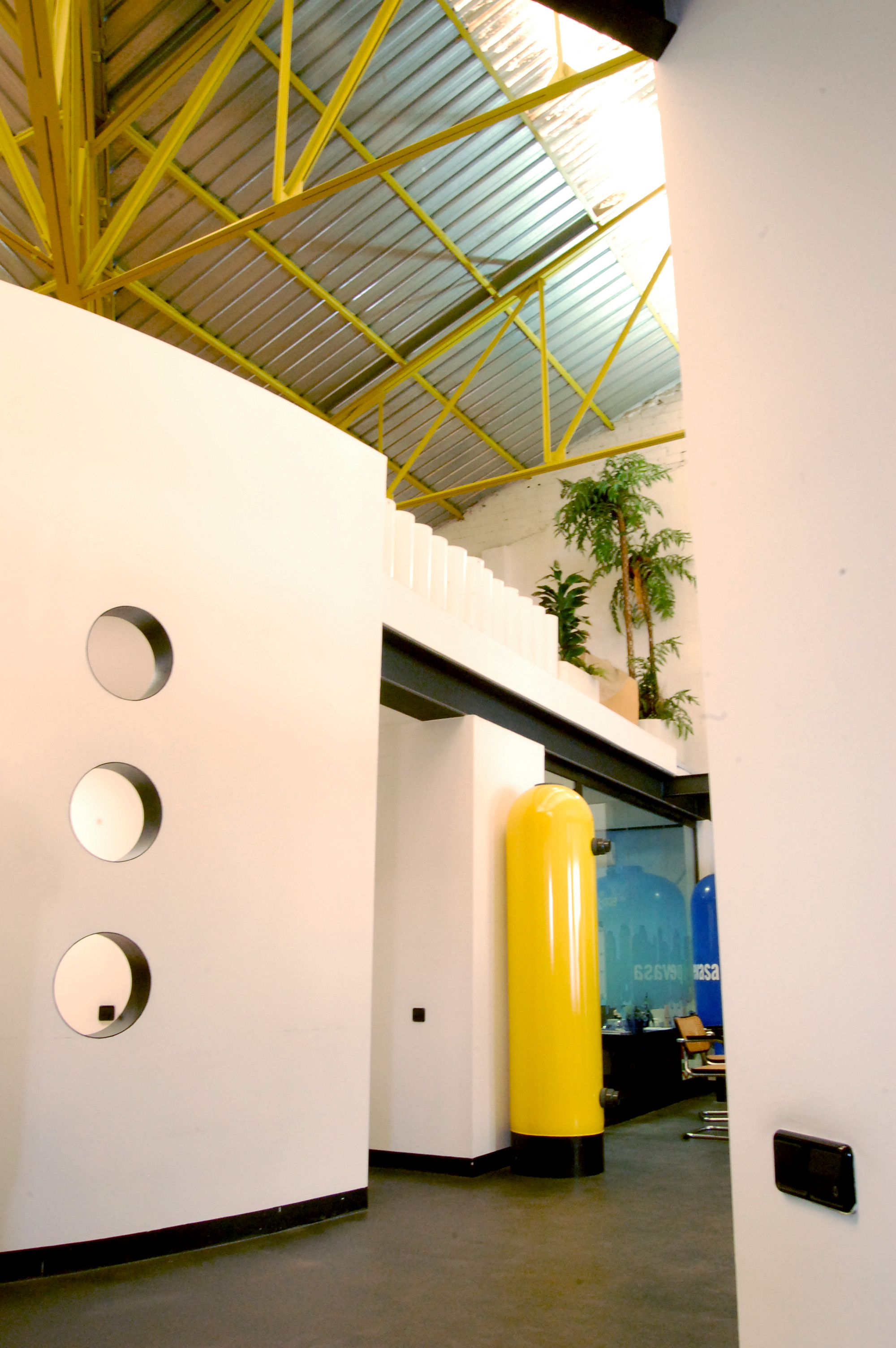 Oficinas y pasillo exposición de los productos de Pevasa. Los colores y la distribución alrededor de una calle interior aportan calidez en un espacio industrial de gran altura.