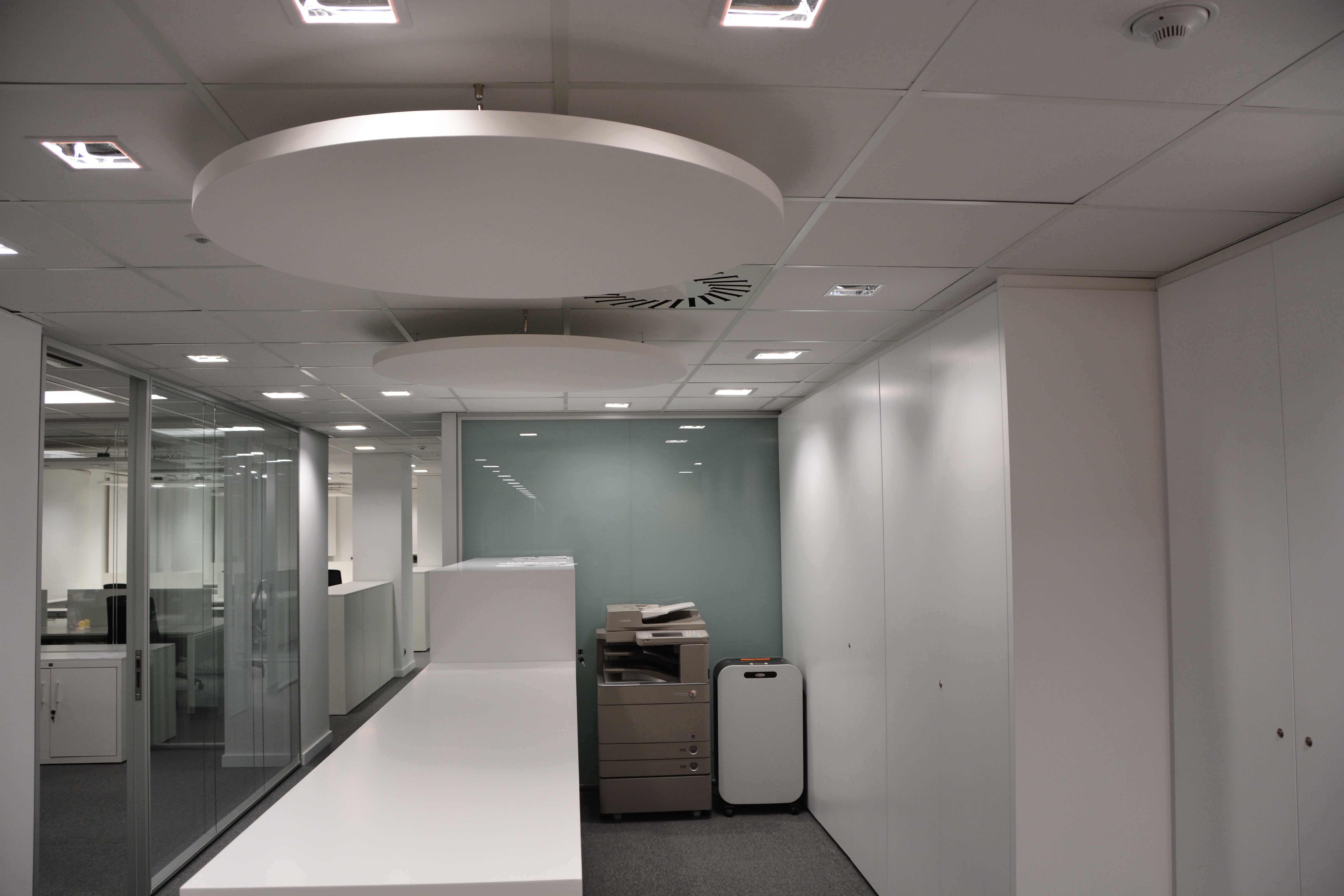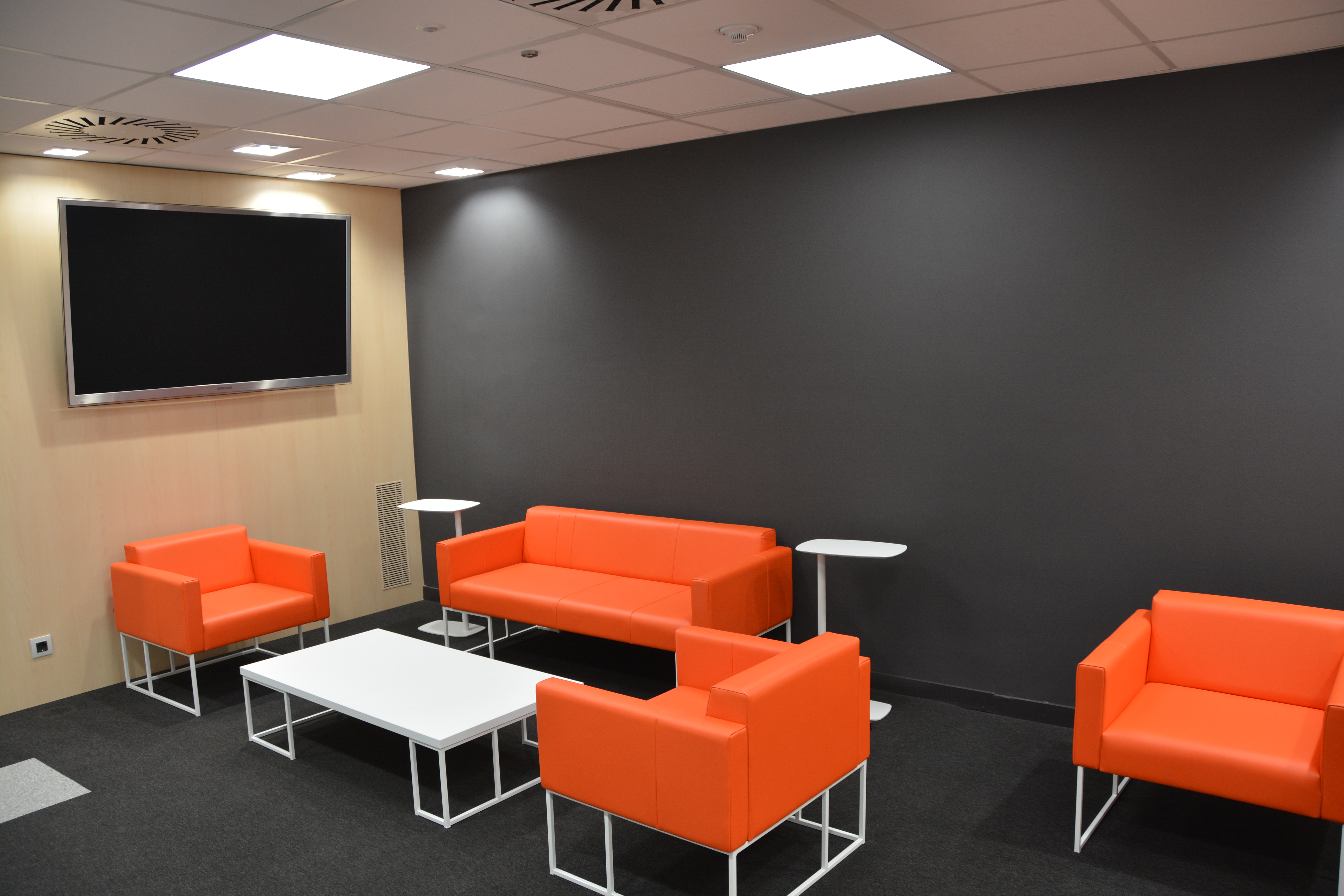 Reforma de la recepción de la planta baja, escalera y planta de oficinas de la primera planta. Creación de zona de descanso, despachos abiertos y salas de reunion, aplicando la carta gráfica de la empresa.