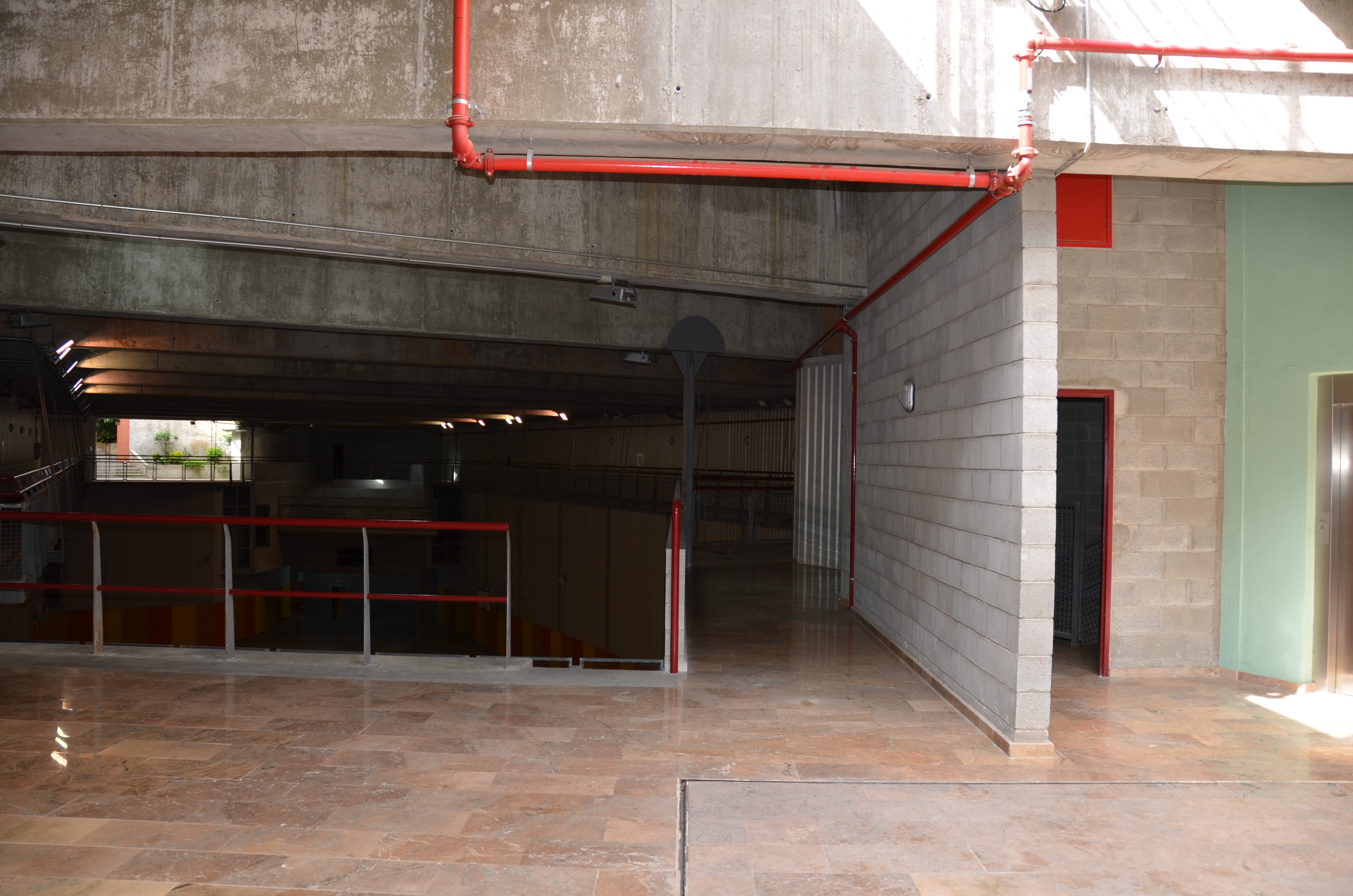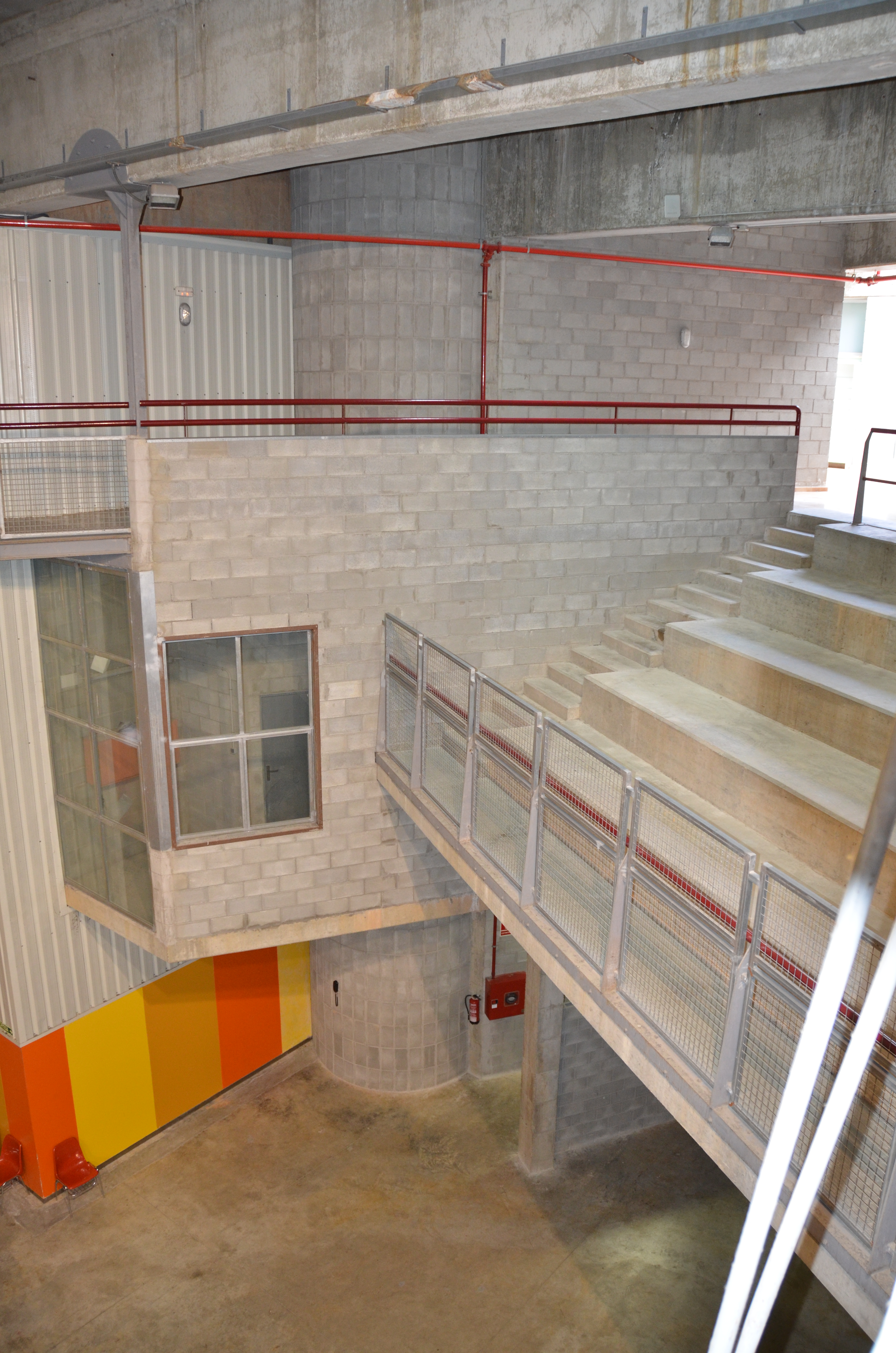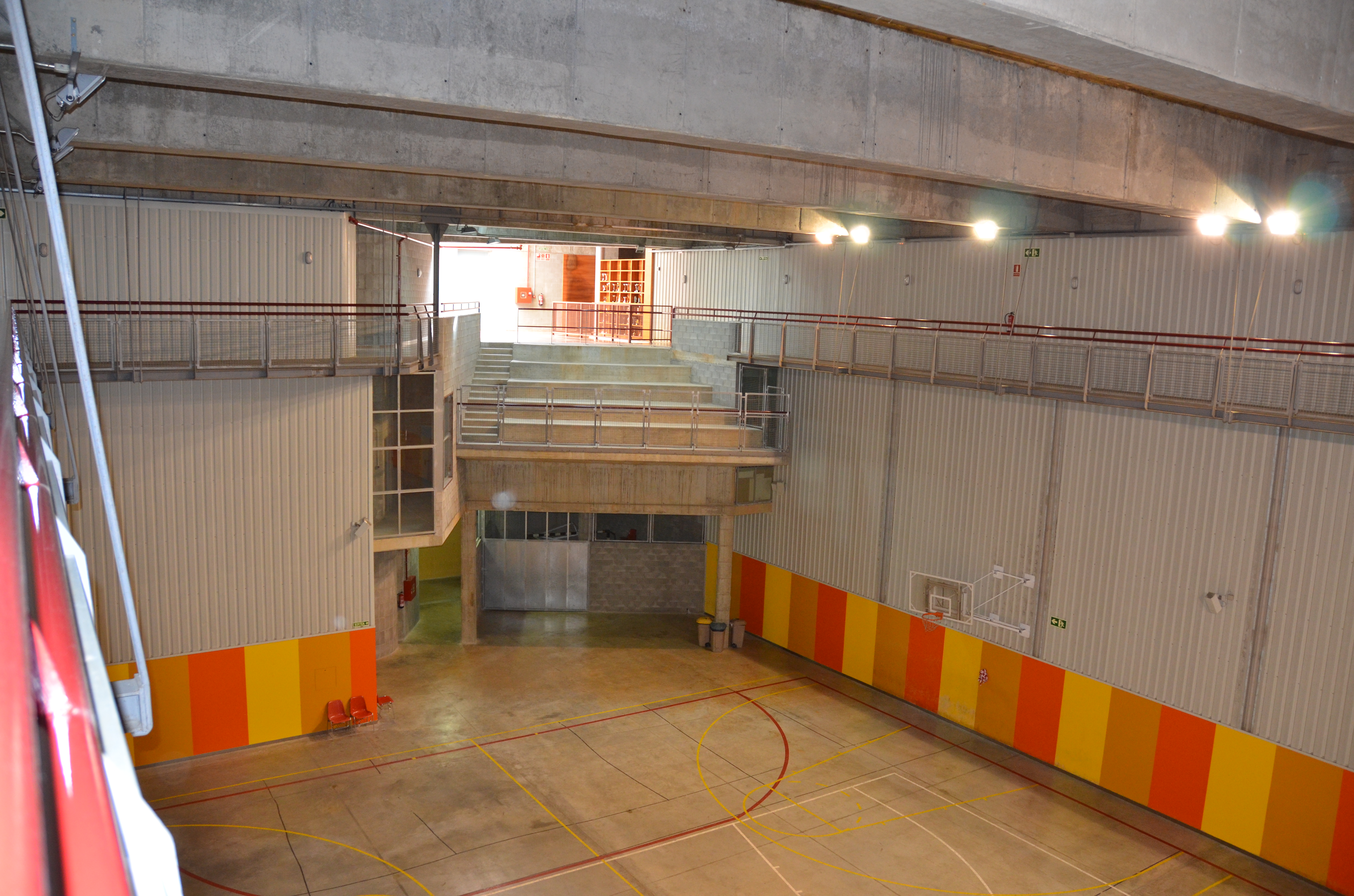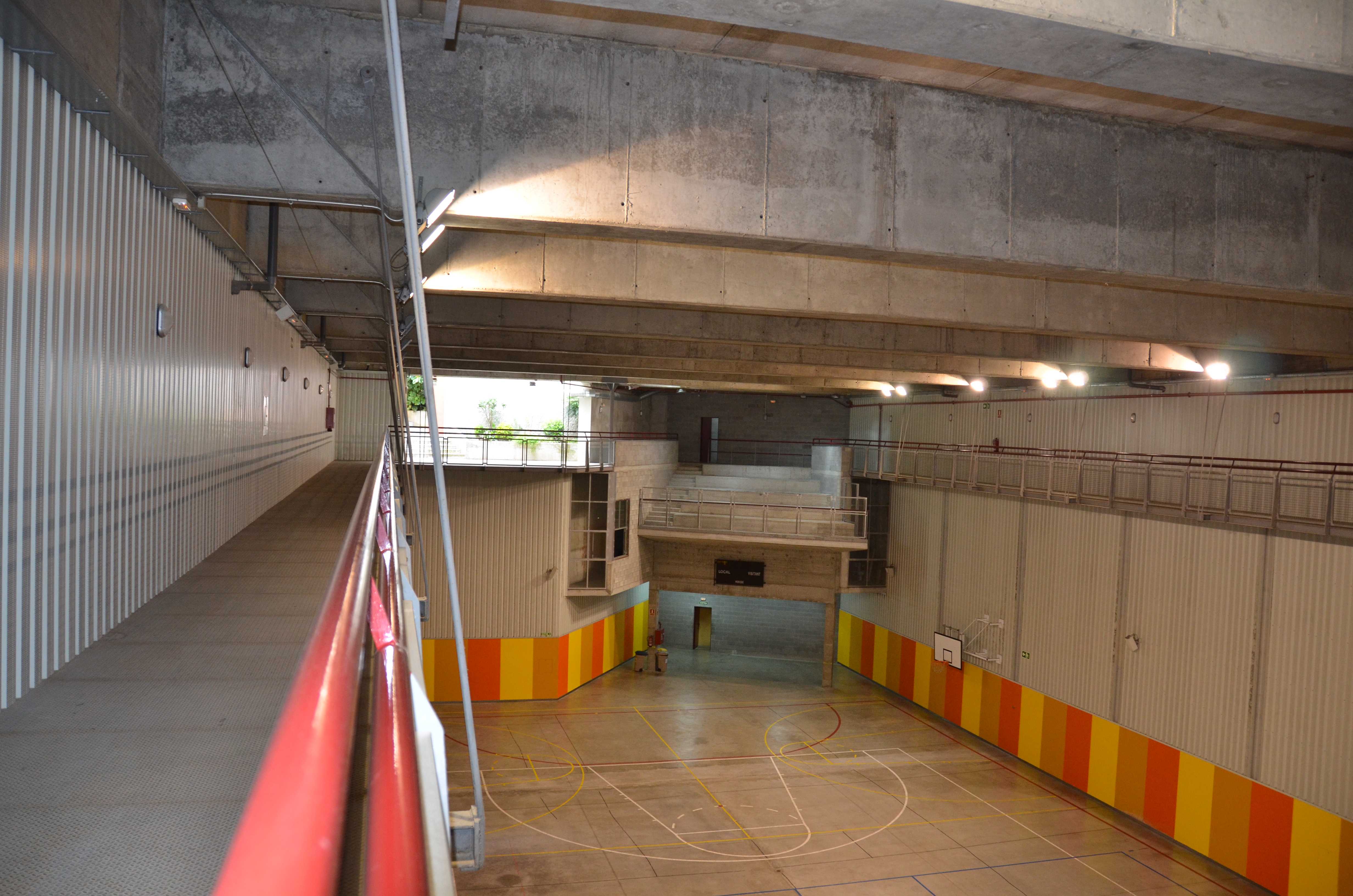 Construcción de una sala polideportiva debajo del patio existente del centro escolar Vedruna. Un reto arquitectónico y técnico. El terreno de juego se encastra entre los edificios existentes, con accesos a sus extremos, que permiten la entrada de luz natural, la colocación de las gradas, y un continuum del espacio con el patio. Dos pasarelas unen estas entradas, haciendo las veces de mirador sobre las pistas de deporte.