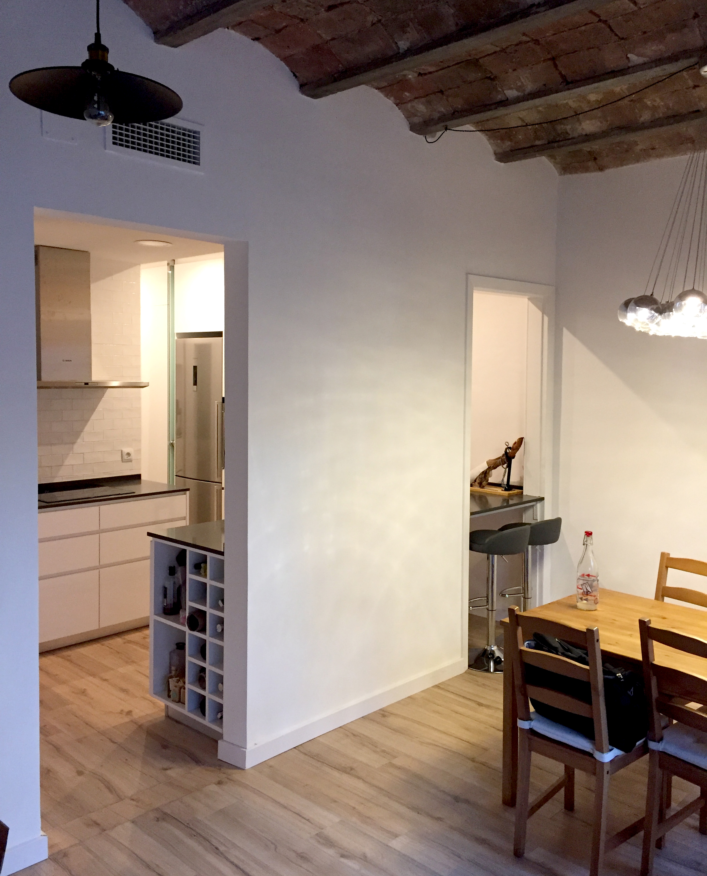Reforma de un piso del ensanche de 75 m2. Las aperturas llevan la luz hacia la cocina interior, y las paredes blancas realzan los materiales originales descubiertos que apelan a la memoria colectiva del hogar.