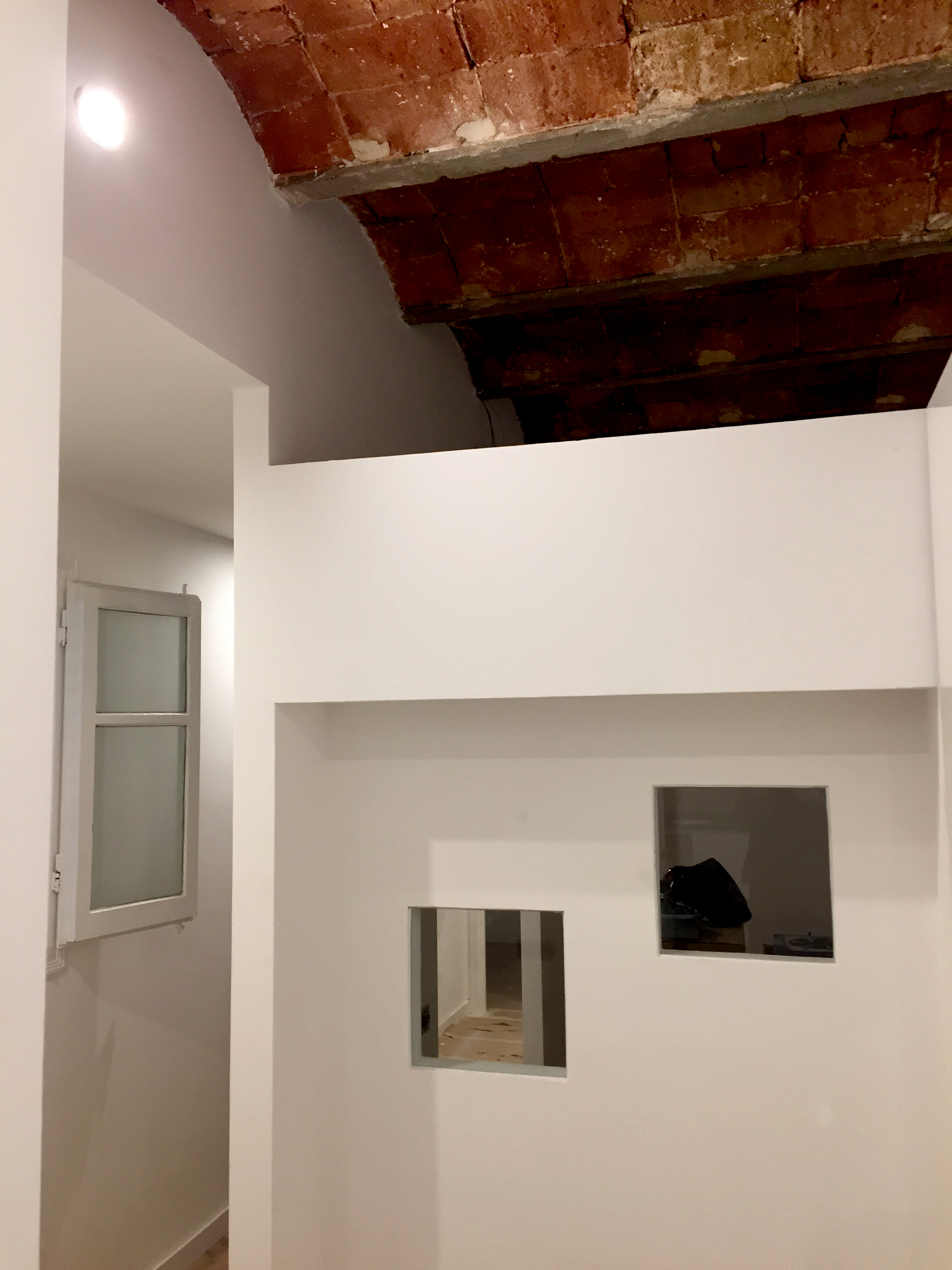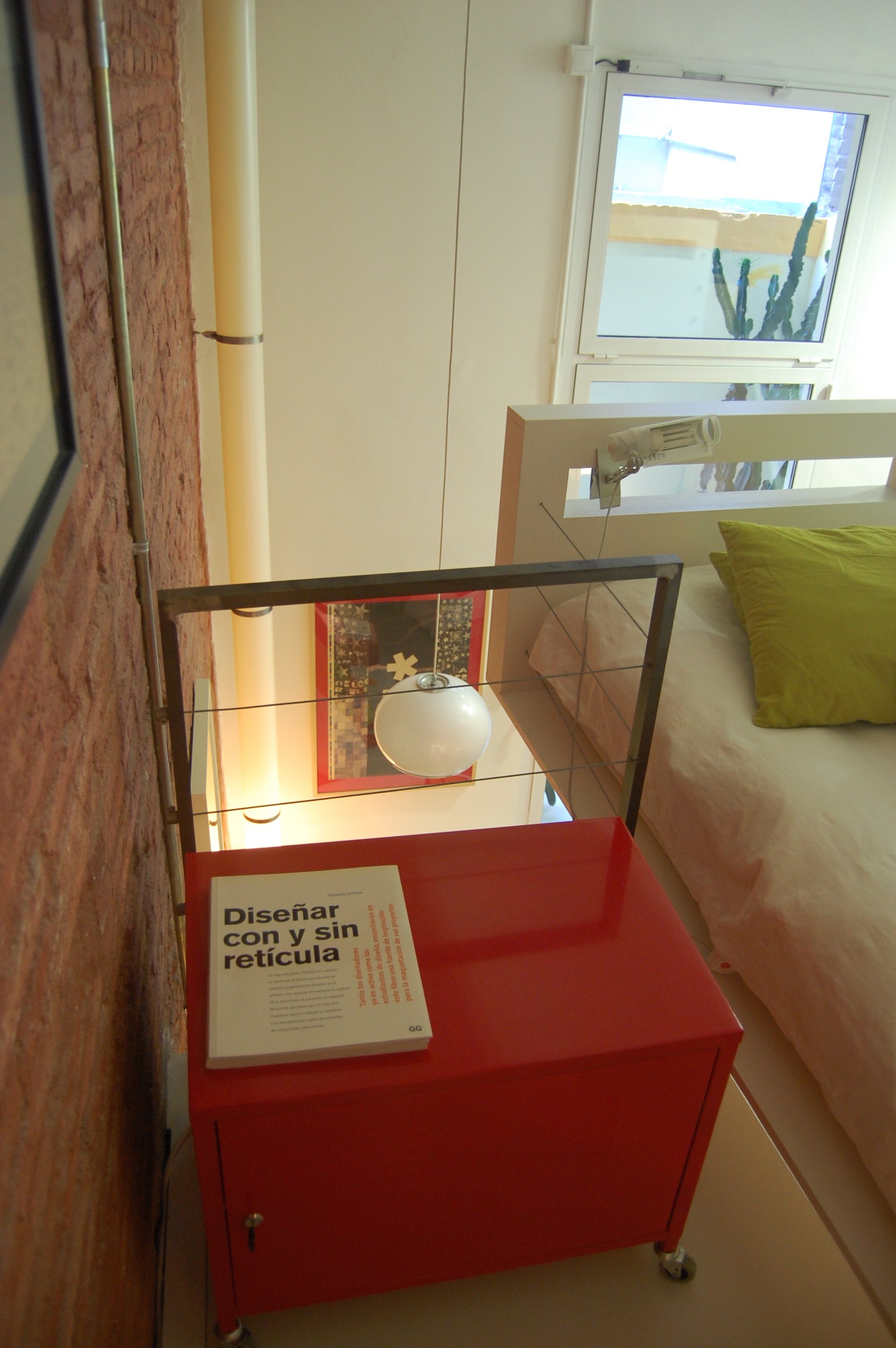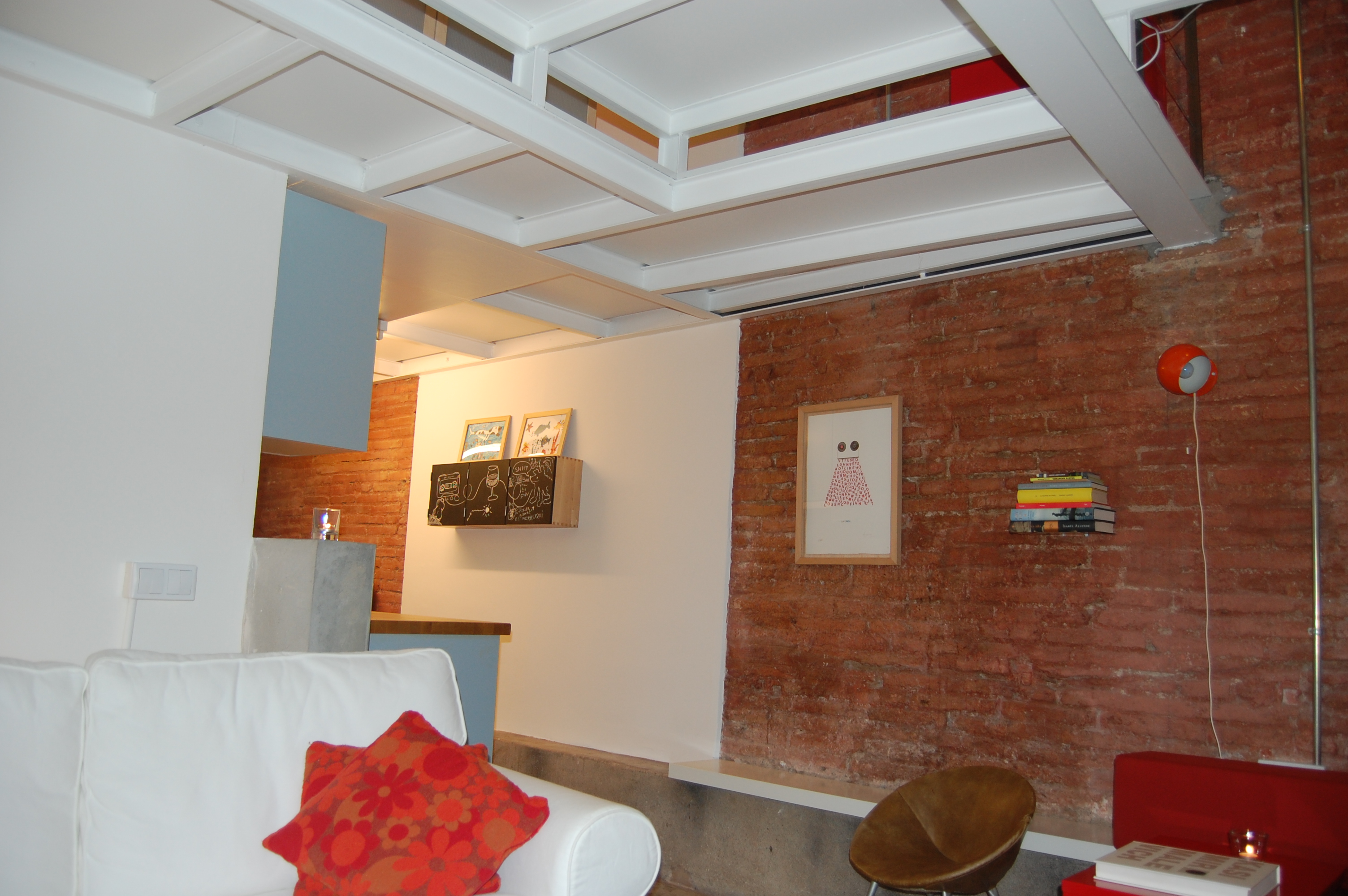 Reforma de un local en vivienda y despacho. El espacio muy estrecho se aprovecha en totalidad, el pasillo es cocina abajo y baños arriba, y la cama de matrimonio se proyecta en voladizo sobre la sala, ampliando el espacio tanto arriba como abajo.