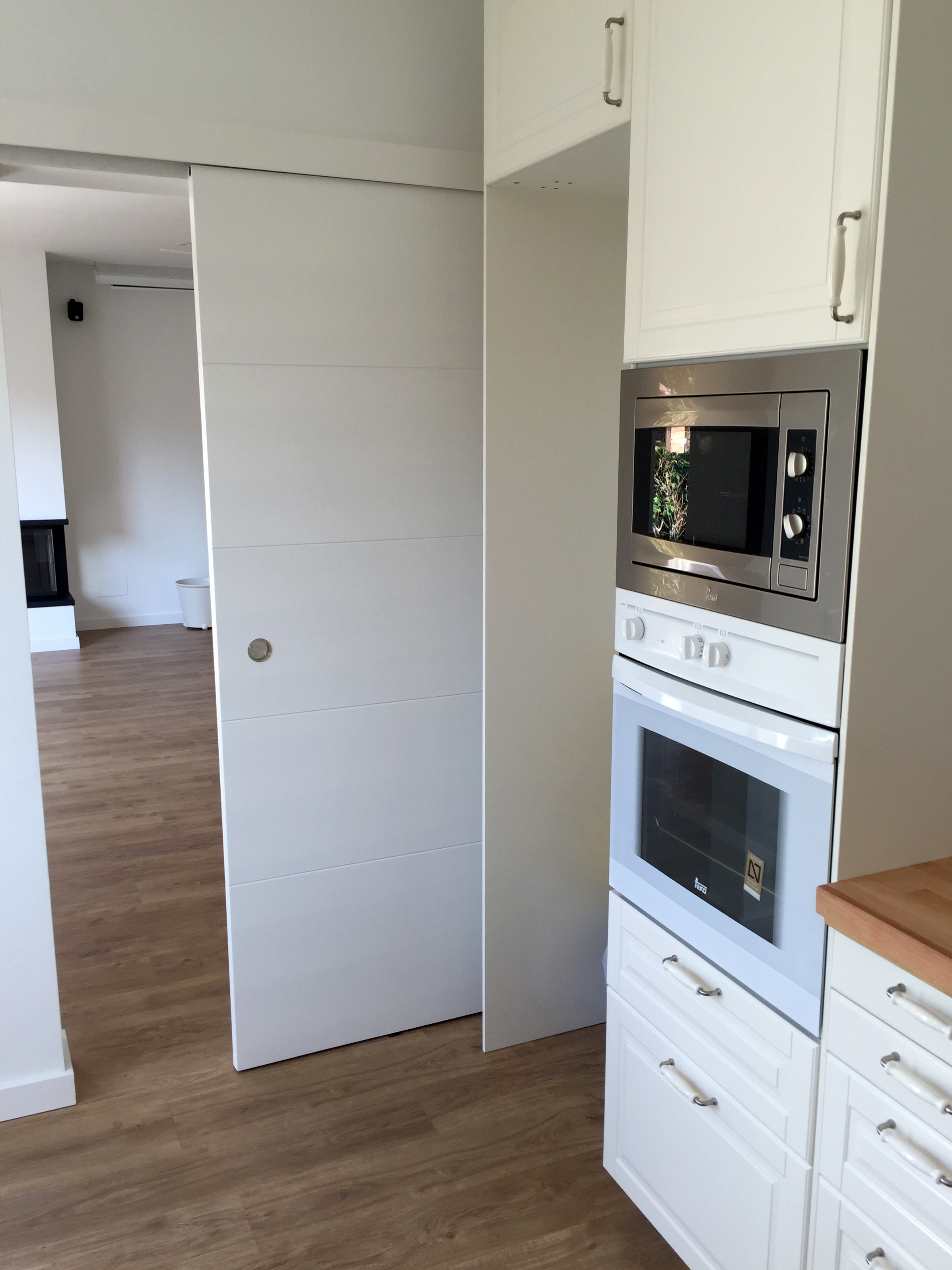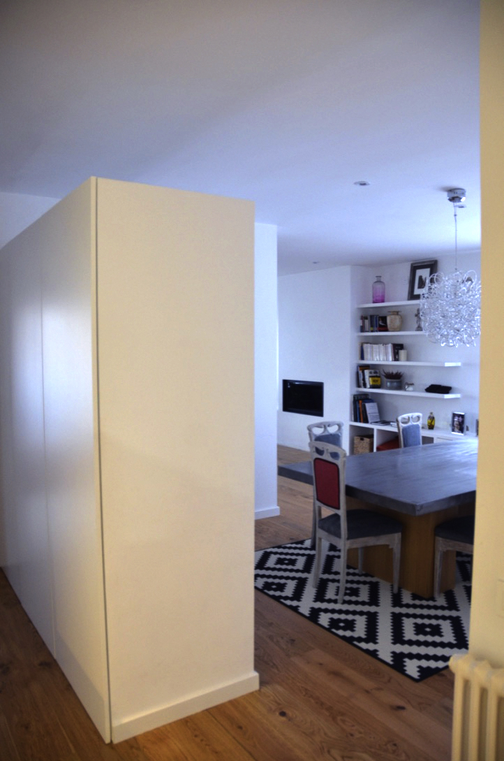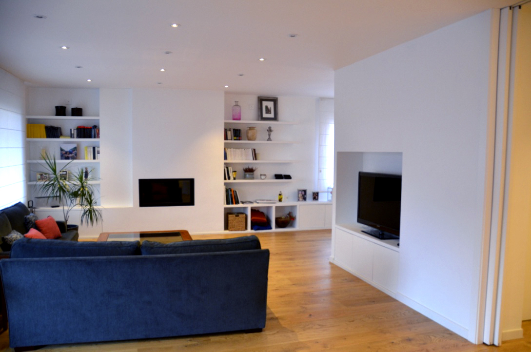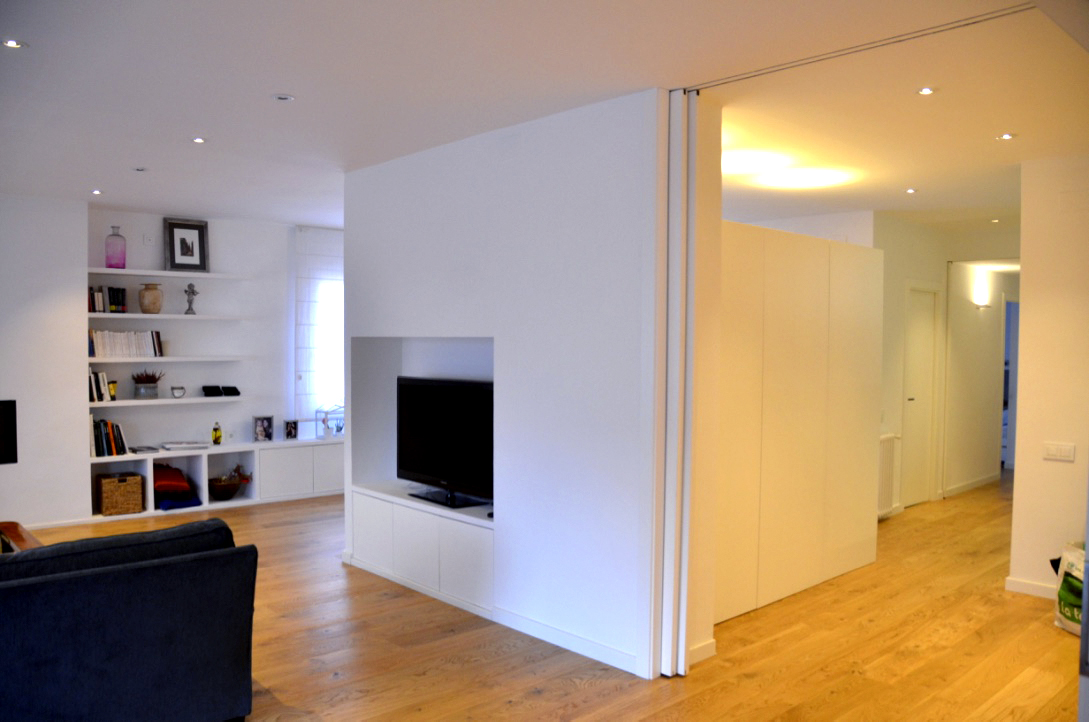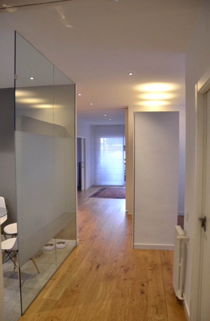 Reforma de un piso de 220m2. Todas las estancias de la zona de día están comunicadas con puertas correderas integradas en las paredes que permiten separar o unir las actividades en cada area, adaptándose a la vida diaria de la familia. En la zona de noche se encuentran tres suites y la sala de ocio.