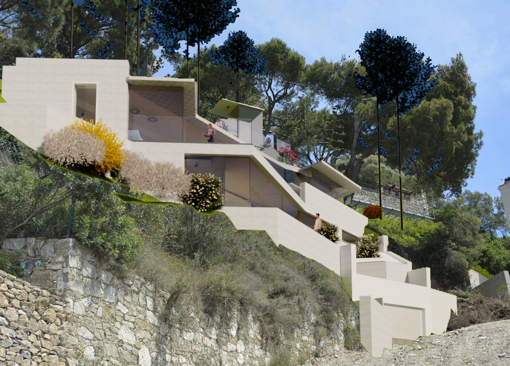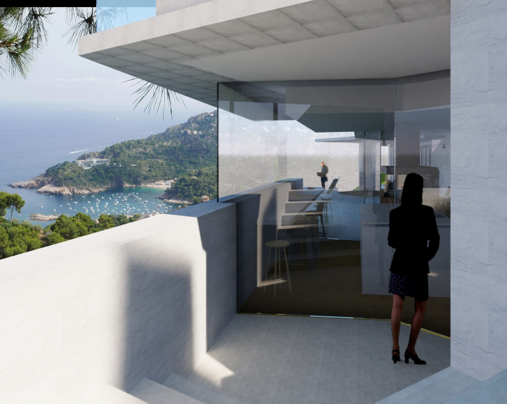 Vivienda unifamiliar para invitados. Desarrollada siguiendo las curvas del terreno, se incorpora naturalmente y discretamente a la falda de la montaña y abre vistas panorámicas sobre la bahía de Begur.