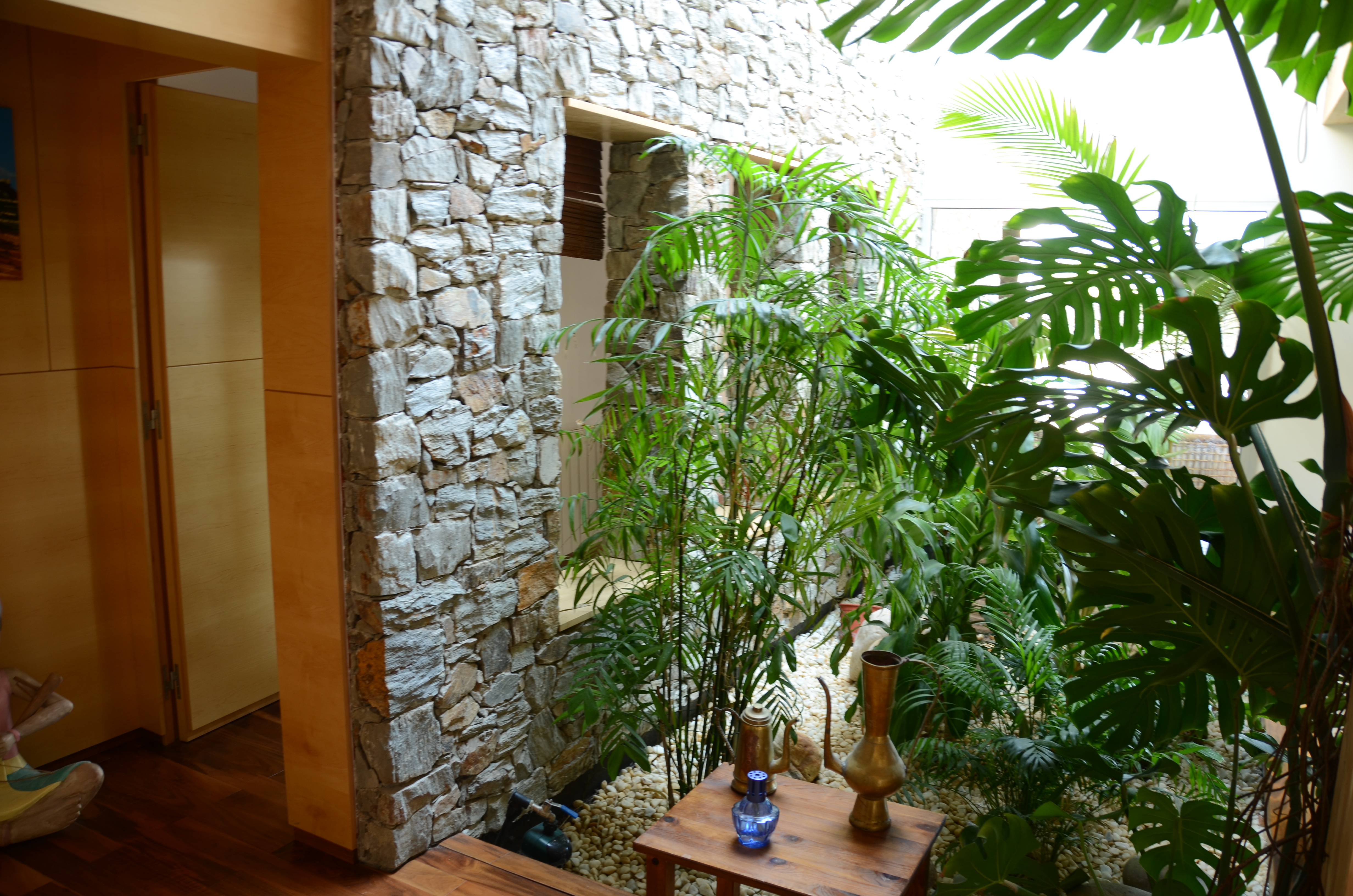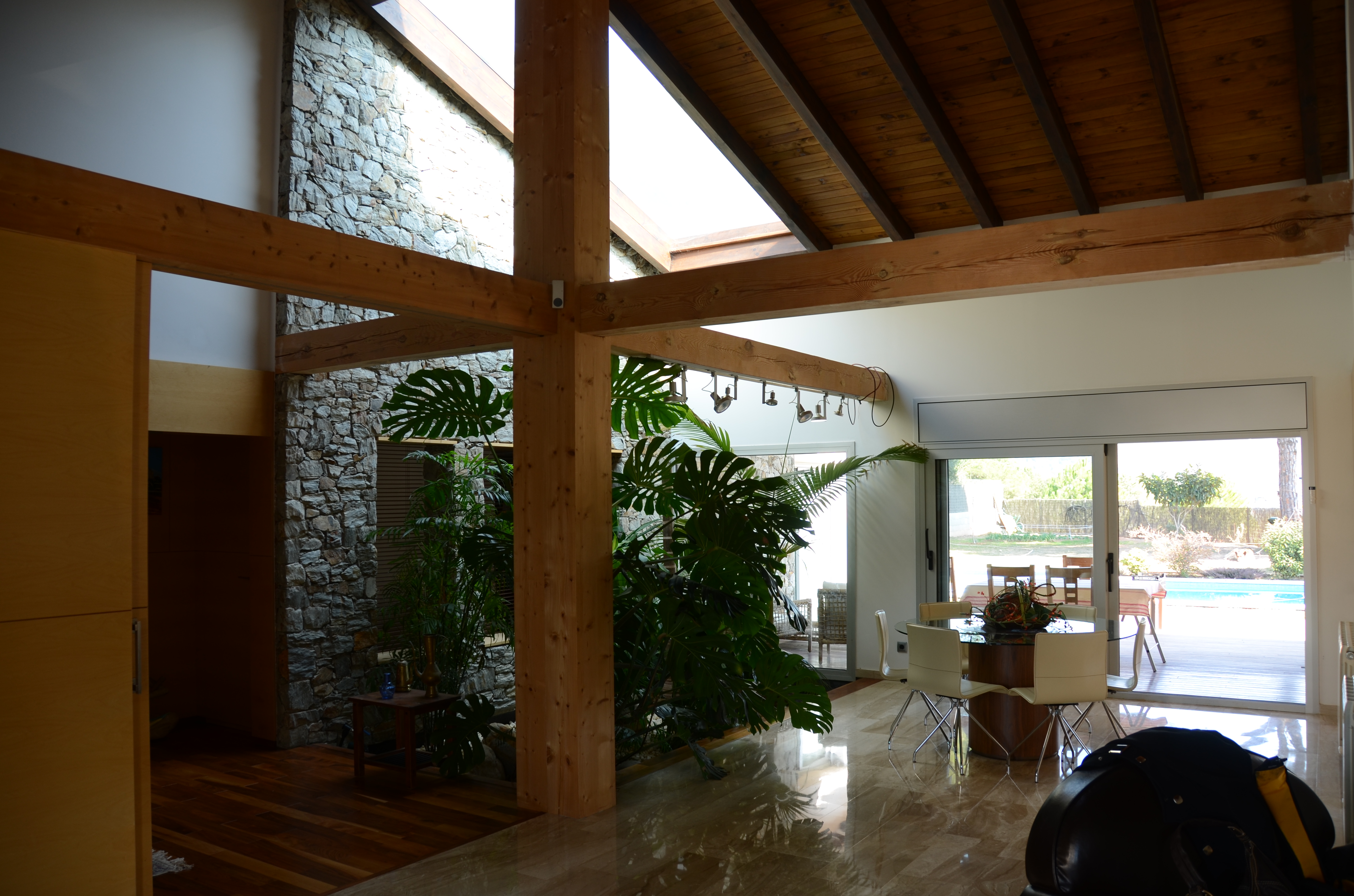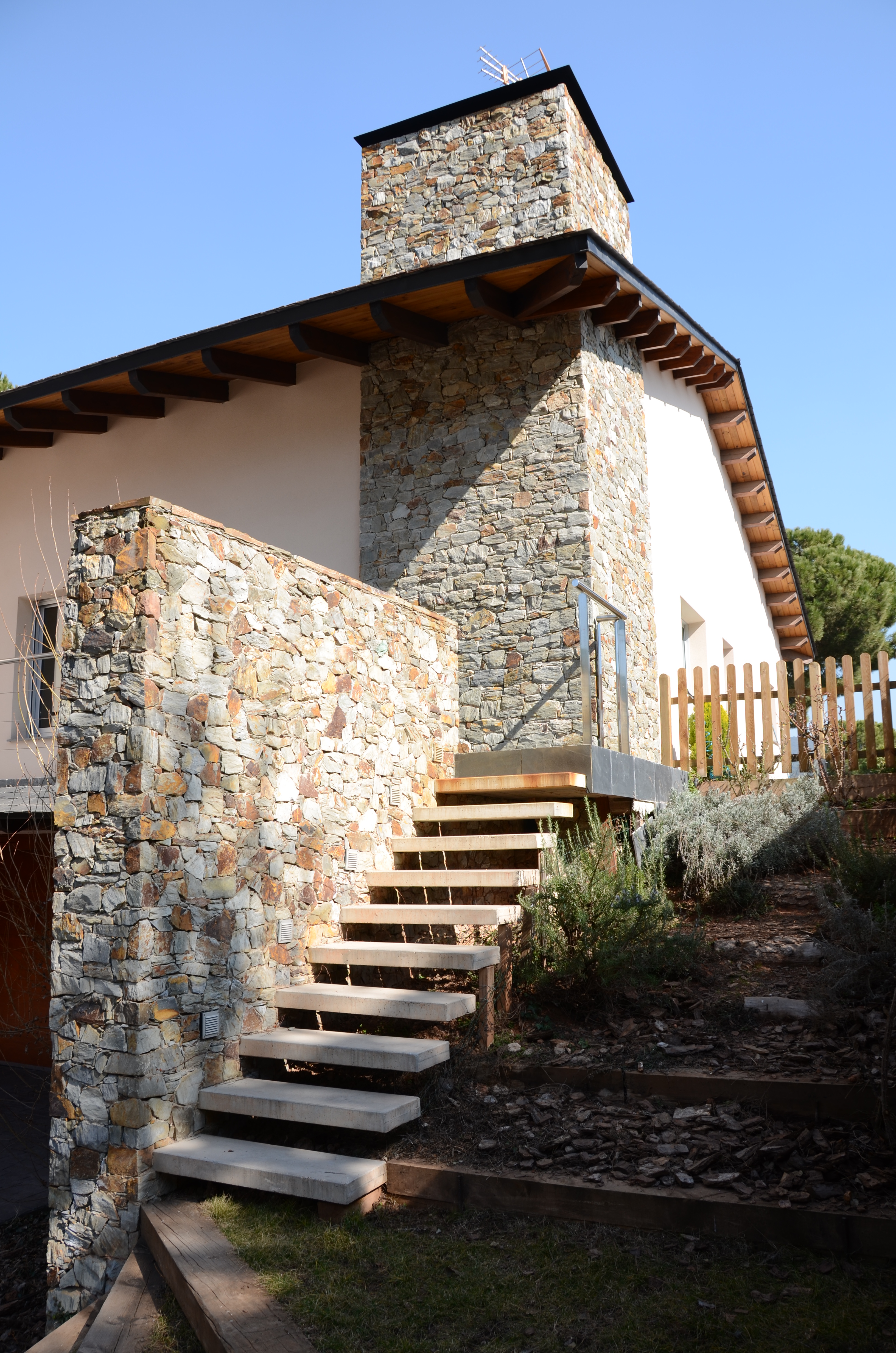 Vivienda unifamiliar que deja el jardin entrar en su interior. Construida con materiales naturales, obra de piedra natural en seco, y estructura de madera.