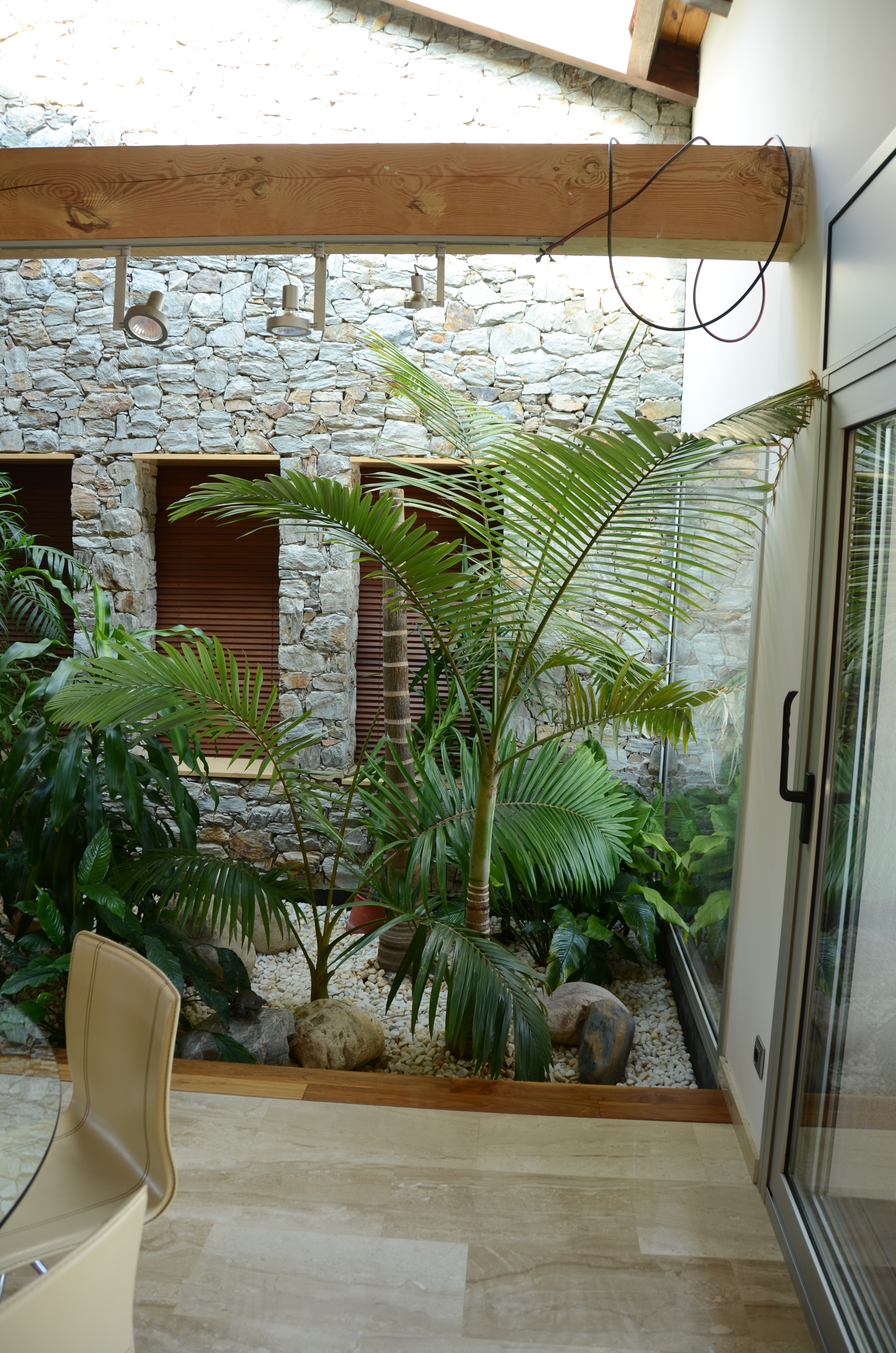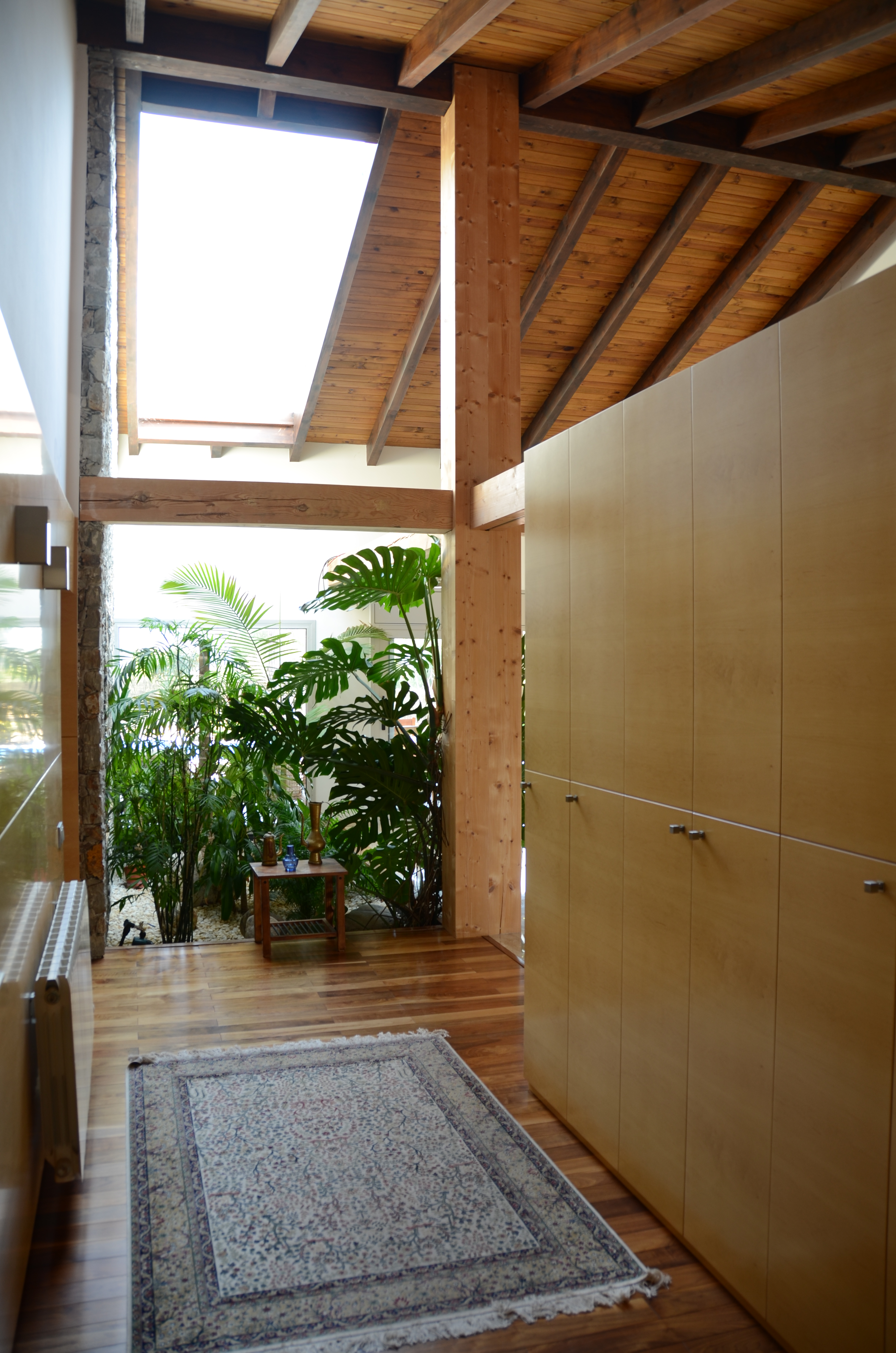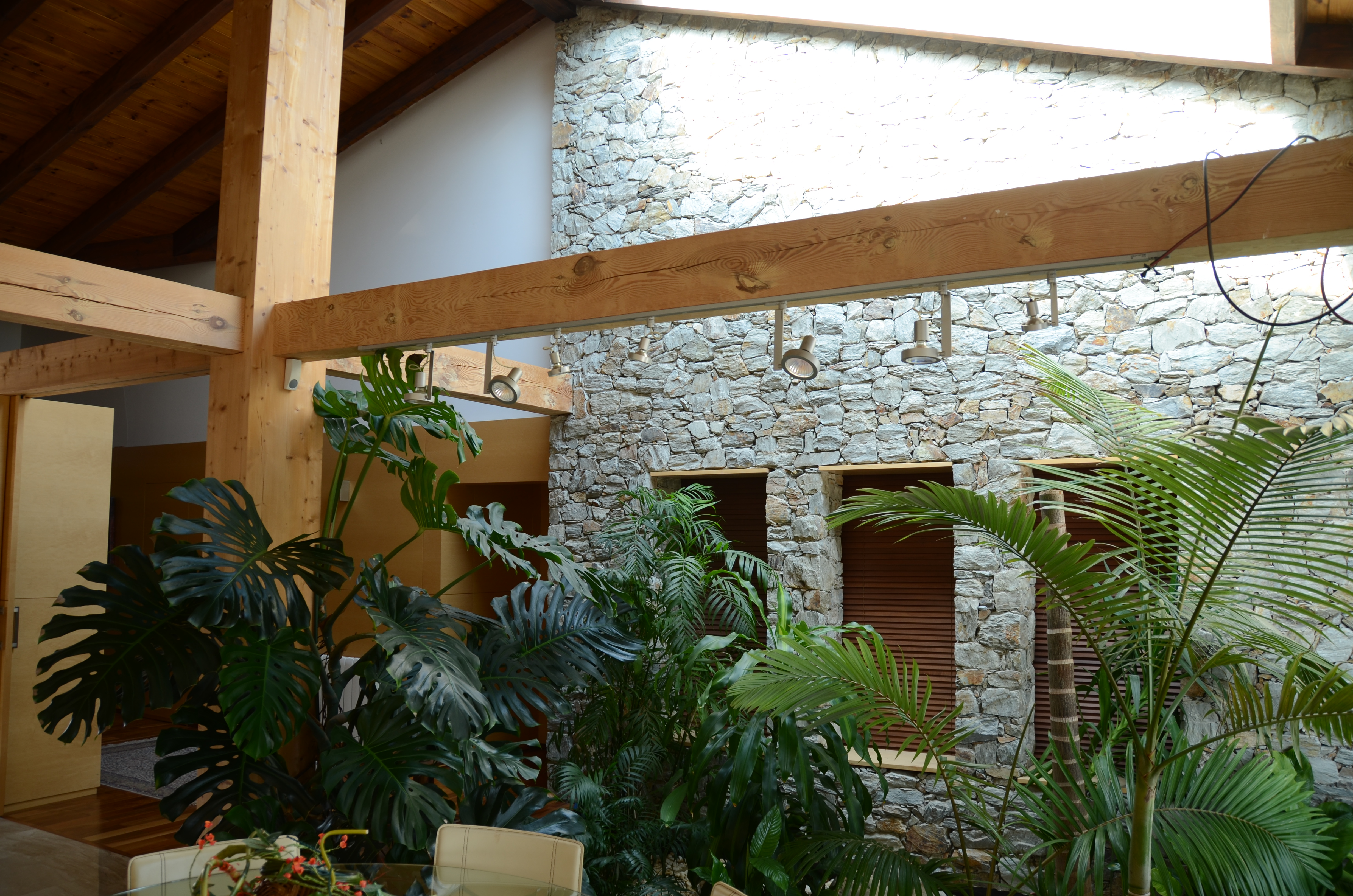Vivienda unifamiliar que deja el jardin entrar en su interior. Construida con materiales naturales, obra de piedra natural en seco, y estructura de madera.